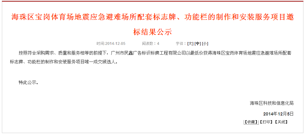 由海珠區(qū)信科局組織的海珠區(qū)寶崗體育場(chǎng)地震應(yīng)急避難所標(biāo)志牌、功能宣傳欄的生產(chǎn)制作及施工安裝服務(wù)項(xiàng)目的招標(biāo)由我司中標(biāo),該項(xiàng)目已于2014年12月05日公告中標(biāo)結(jié)果?,F(xiàn)正進(jìn)入產(chǎn)品的深化設(shè)計(jì)和生產(chǎn)制作階段,我司有有信心將該項(xiàng)目順利完成,工程項(xiàng)目竣工標(biāo)準(zhǔn)達(dá)到優(yōu)良標(biāo)準(zhǔn)。