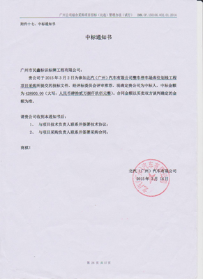 北汽(廣州)汽車有限公司整車停車場庫位劃線工程項(xiàng)目中標(biāo)通知書